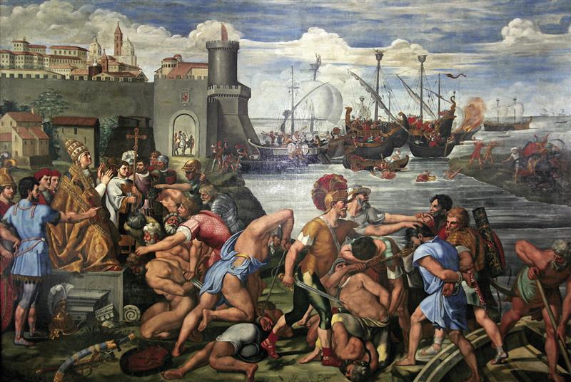L’episodio della battaglia di Ostia, tratto dal Liber pontificalis, importante fonte storica del primo Medioevo, fa parte di un più vasto programma iconografico teso all’esaltazione dei pontificati di Leone III (795-816) e Leone IV (847-855), non senza ovvi riferimenti al papa allora regnante Leone X.